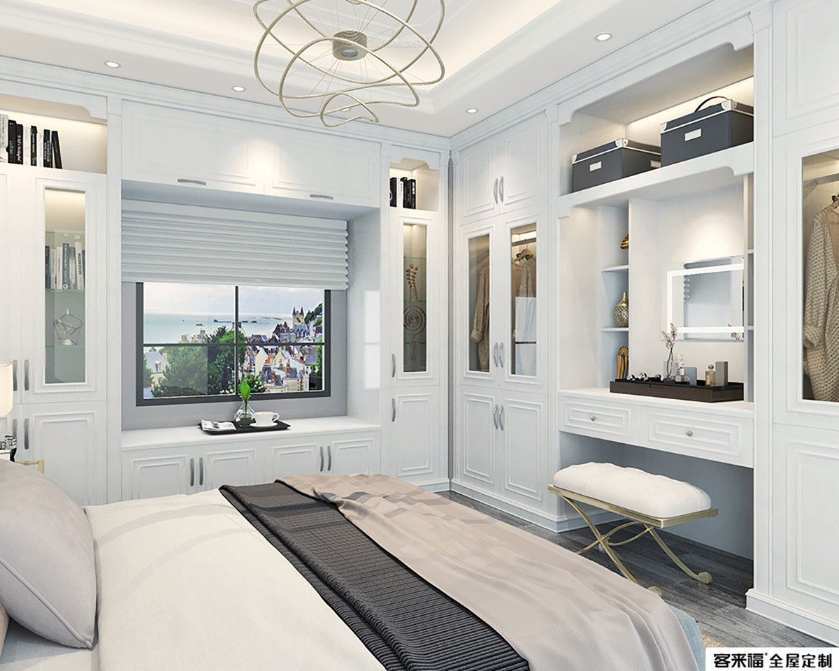 The combination of the bedroom and the cloakroom enlarges the storage function, and the combination of natural wood color and warm white is fresh and natural.