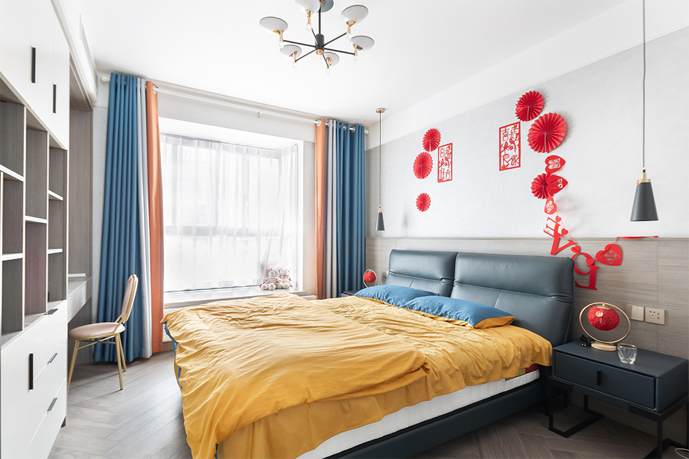 用蓝色墙布覆盖在墙面,对墙面起到很好的保护作用。次卧最大的亮点在于房间内设计了一个隐藏的衣帽间,在柜子内做出了U形的布局,将内部空间分层,可以放置衣物和棉被。空间内部既不会显得突兀,关上柜门之后内部空间更加完整。