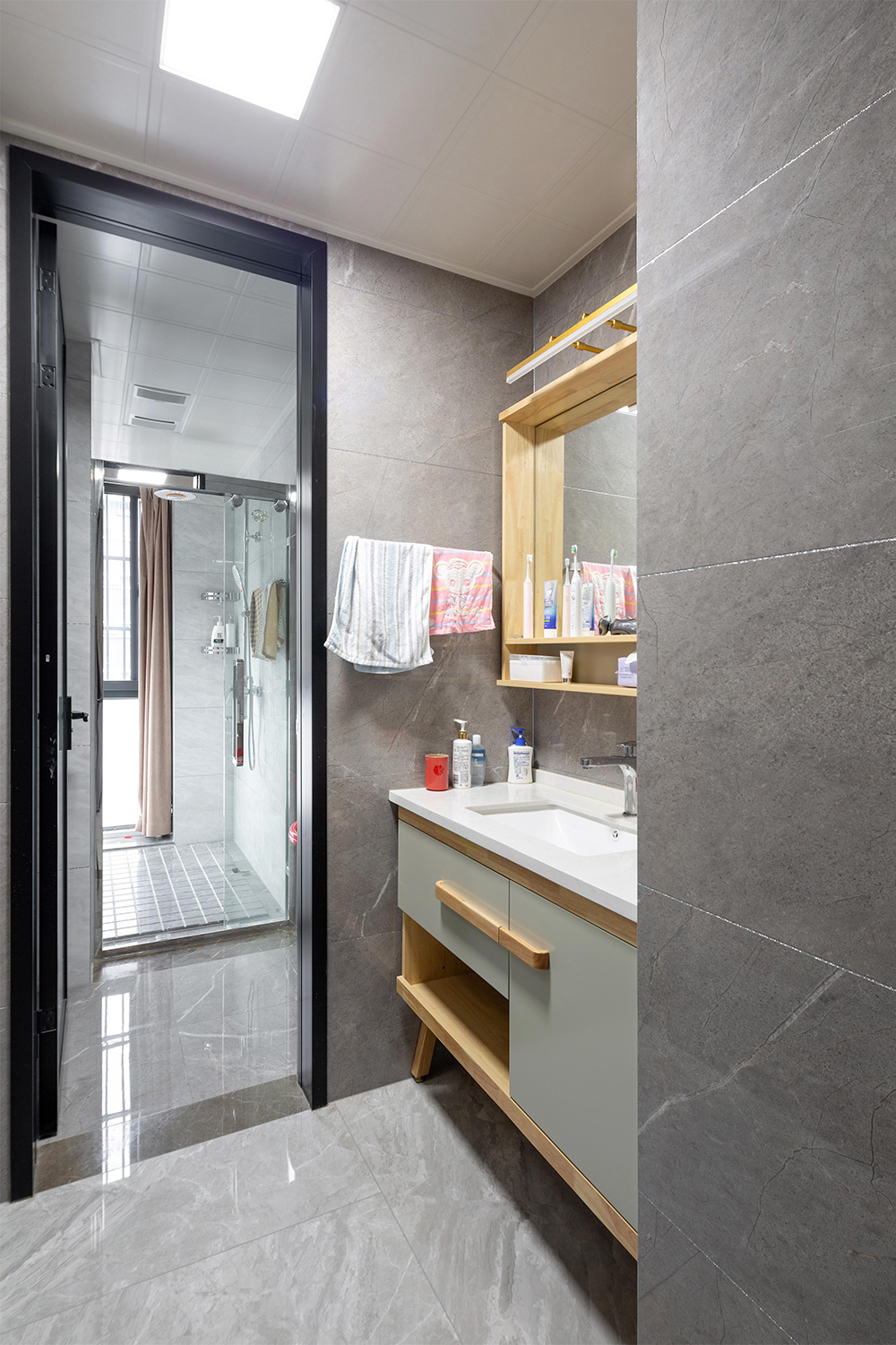 卫生间延续了整间房屋的风格,采用原木风的设计,明亮的灯光显得柜子光泽更加透亮。在柜子底部留出空间便于湿气的蒸发,径直延伸的空间方便做干湿处理。