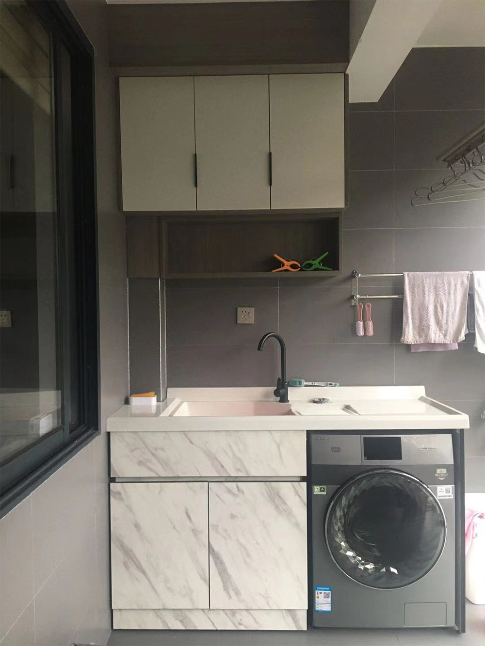 连体的洗衣机柜台,下方采用白色大理石纹路的柜门。上面做了挂柜的设计,既节省空间,又方便了物品的放置。