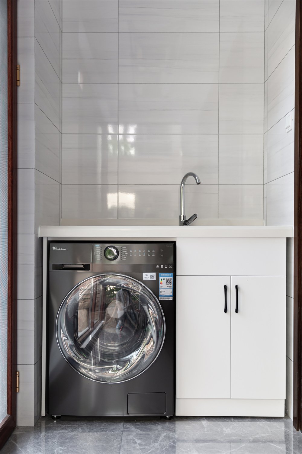 主要的阳台位于一楼,从阳台就可拉开门进入自带的小院。阳台处装修的十分简单,极简的白色洗衣机柜,地面是与客厅处一脉相连的灰色系地砖,简简单单不会削弱中式风格的基调。大部分户型都会在阳台处做洗衣机柜,不仅节省装修空间,而且美观大气。