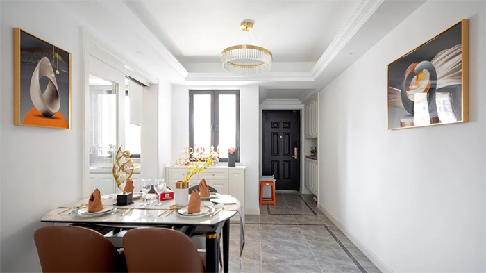 餐厅处由于没有完整的空间,位于厨房一侧。圆形餐桌可以伸缩变换适合不同家庭人数需要。摆上精美的餐具与家人一起共进美味佳肴。在厨房旁进出都很方便,需要注意的便是厨房内的通风情况。