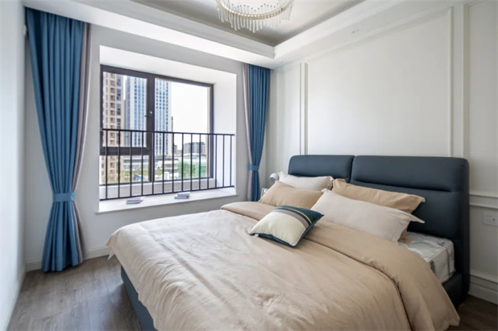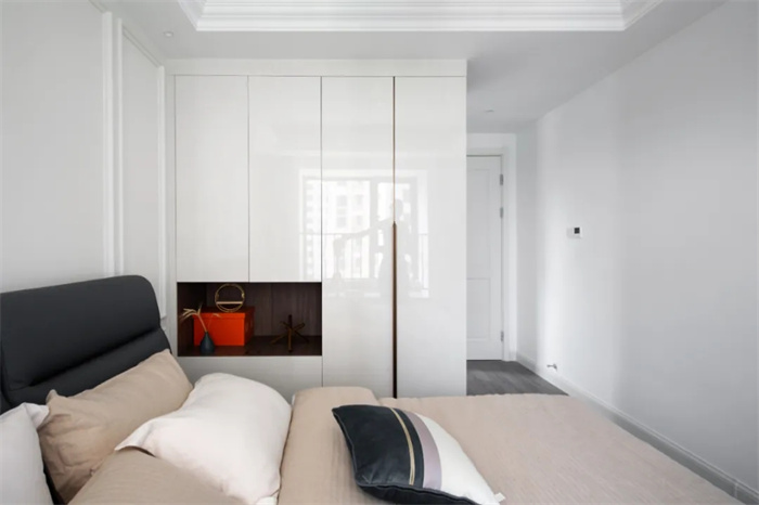 卧室采用膜压板背景墙,石膏线给背景墙增加层次感。飘窗处安置了护栏,为孩子的安全保驾护航。整面的衣柜处在左侧做了镂空,给白色增加点质感,显得小巧又实用。