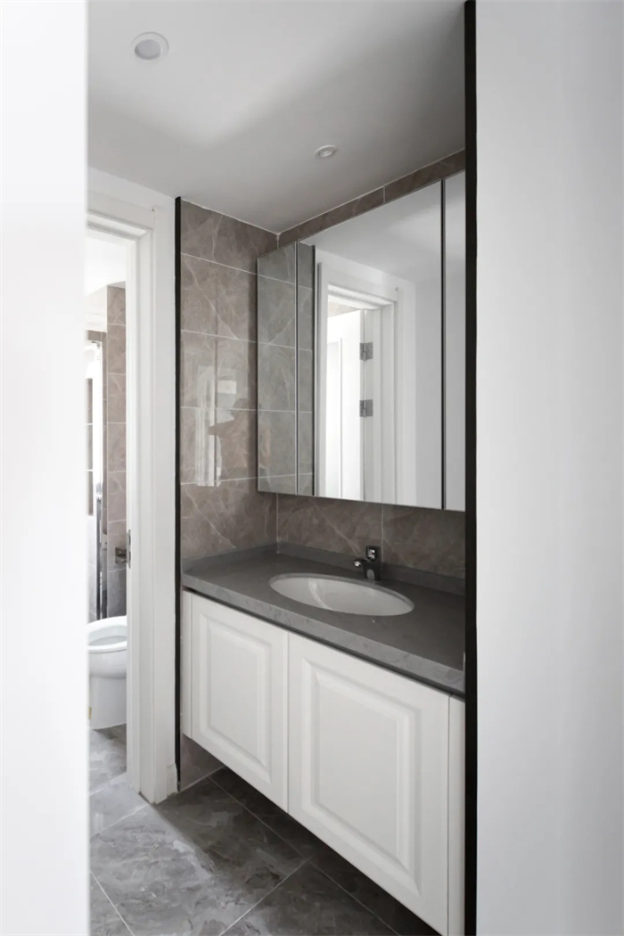 卫浴处下方先是芬兰白膜压门板,里处打造半包围形的淋浴间,下方踢脚线抬高避免水流的流出,整体卫浴间做到了干湿分离。