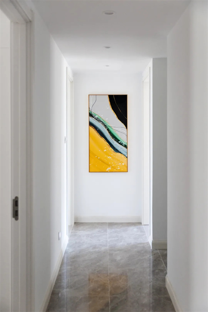 走廊起到连接和贯通的作用,两侧分布着卧室和儿童房,墙上如沙滩海浪的挂画,给人清新的感受。