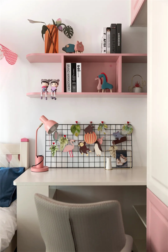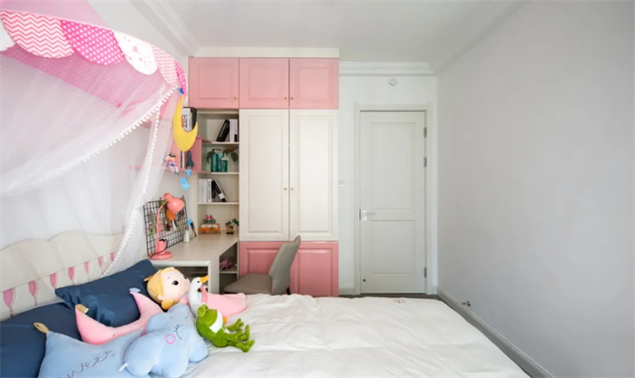 由于户主家有个小女孩,所以在颜色搭配上选择了粉粉嫩嫩的粉色,与白色中和,整体十分柔和,仿佛掉进糖果蜜罐里。床上放置了一些娃娃,也是非常用心了。