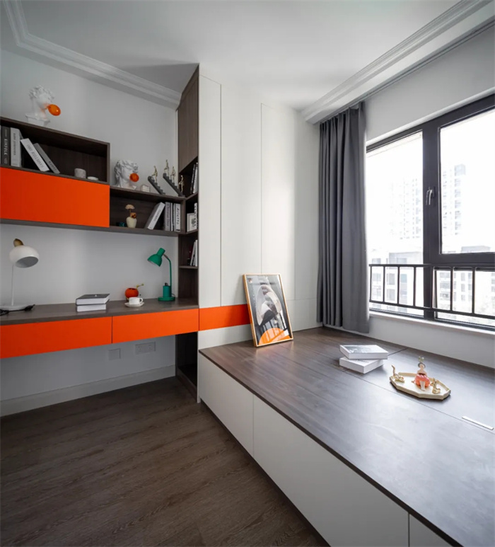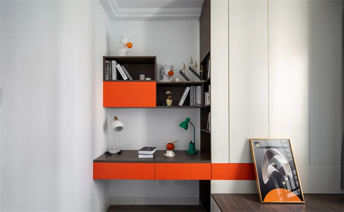 此间卧室的床铺采用榻榻米的设计,床上方可以自如掀开储放杂物。整体空间选用最亮眼的橘色搭配不冲突的橡木纹,在视觉上给人以冲击感。书桌上方安置吊柜,留出一段距离不至于显得拥挤。