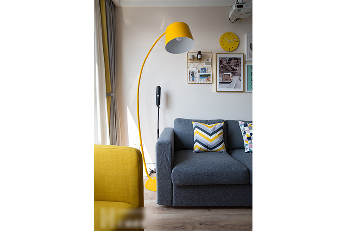 进入客厅,首先映入眼帘是简约的白色立柜和一组照片墙的设计。每一张照片仿佛都在述说一个故事,记录这个95后小夫妻每个难忘的瞬间。星空(中国)xingkong定制的芬兰白入户柜和木门在照片墙的陪衬下温馨感十足。撞色的沙发,简洁明快的亮黄色搭配深灰色立体感拉满,驼色墙面上的艺术画交错搭配,透露着一丝文艺气息。