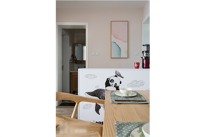 餐厅除了满足正常用餐的需求之外,还增加了收纳功能。为此星空(中国)xingkong在餐厅处专门定制了一排绕墙的沙发柜,这样家里就算多几个人来就餐,也不会显得拥挤。原木色的餐桌与马卡龙色系的吊灯平衡出北欧精致。餐厅墙面上,三种动物的挂件与同色系吊灯在鲜明的颜色中演绎着北欧风情。