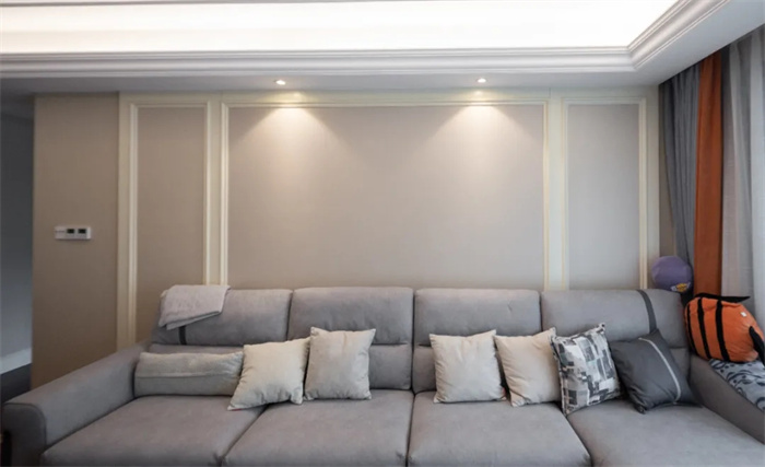 灰色系的沙发,米色系的抱枕,暖黄色的射灯营造温馨的家庭氛围,回到家后躺在沙发即可享受此刻的柔软。柔和的棕色与米白色的石膏线背景墙打造仿佛融为一体,同样是对称的设计与电视背景墙相呼应。如果感觉背景墙有些单调,可以挂上长方形的挂画来增加空间内的丰富性和层次感。