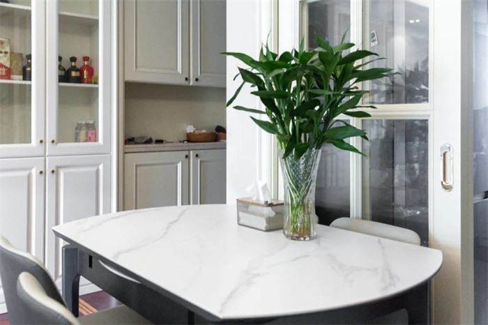 左侧便是与玄关柜相连的餐边柜,餐边柜集酒柜、收纳柜的功能于一体,最大限度发挥出产品的使用价值。芬兰白的门板颜色与透亮的玻璃相搭配,不需要额外给物品增加神秘感,想要的东西拉开柜门便可以拿到。餐边柜中间部分上方的围栏设计,放置石膏雕像增加空间内的艺术感。