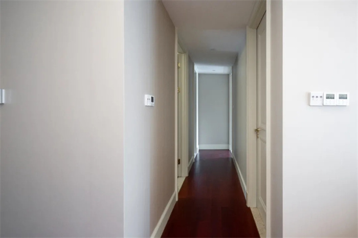 走廊中间空间相对较窄,在走廊尽头为主卧和储物间,若想要增加空间内的丰富性,可以在走廊尽头加上一幅挂画,使色彩更为丰富。