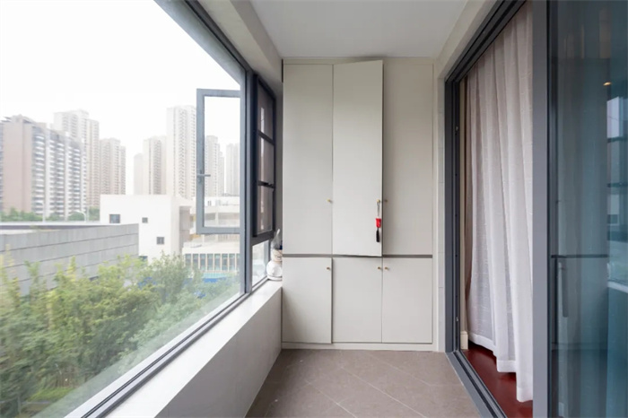 整个阳台具有一定的长度,在另一侧打造成多功能储物区。门板颜色光泽度高,手感温和,耐磨损耐用,在阳台处改造成为休闲区,放上桌椅板凳。眺望窗外即可获得片刻的休闲。
