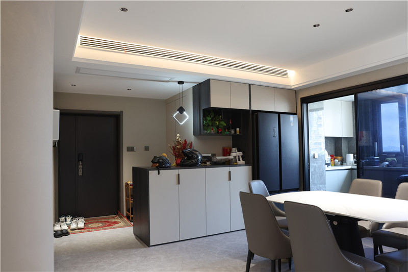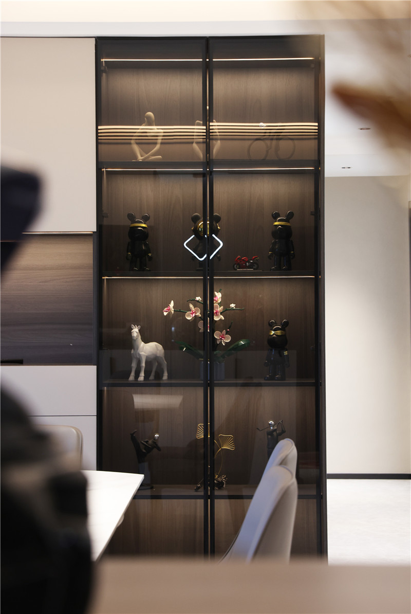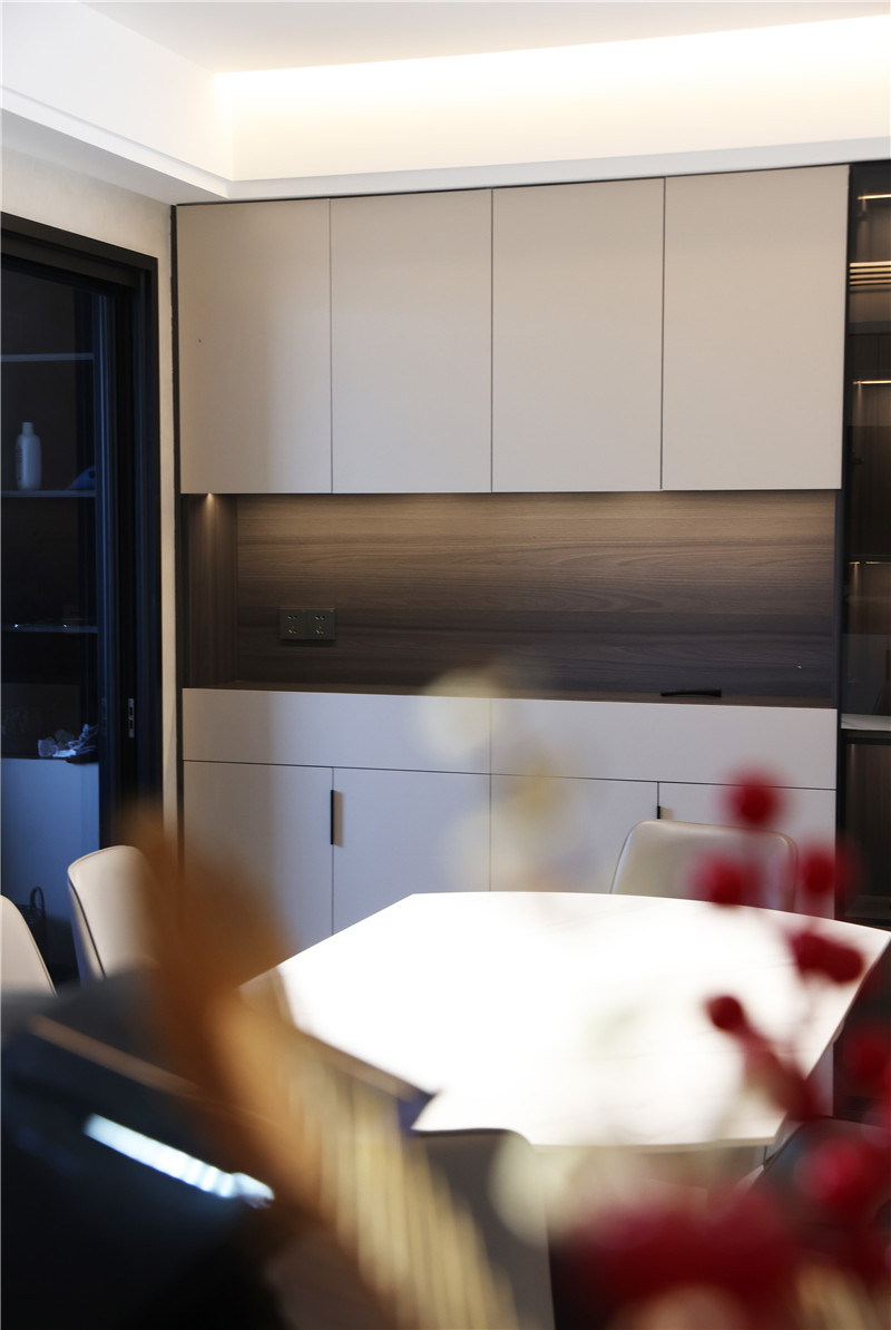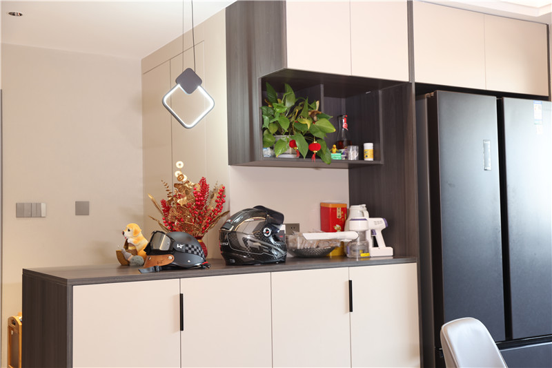餐边柜与入户柜统一材质,中部保留空间放置物品,再加上两竖排玻璃柜,为餐边柜带来轻奢氛围,既增加整体颜值又可以充当酒柜或装饰柜。经典的餐边柜设计适用大小户型,值得还在观望的伙伴们借鉴。