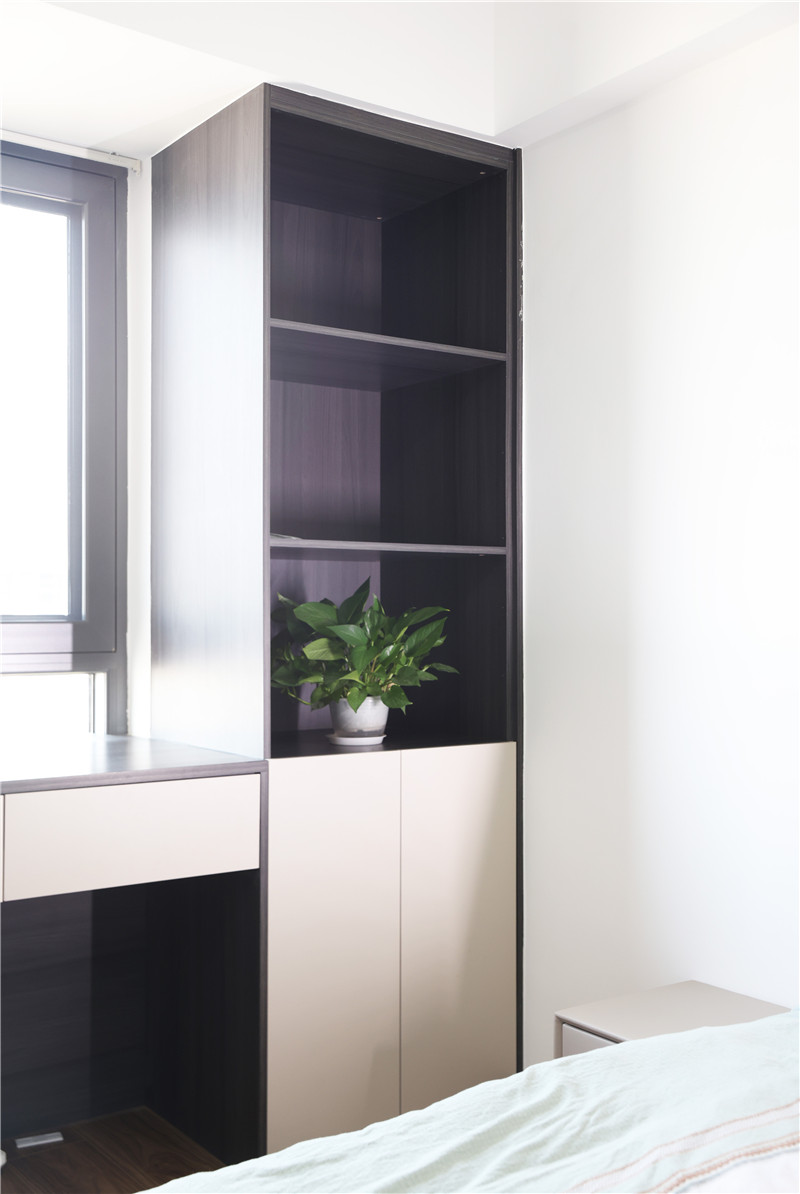 靠窗作书桌与收纳柜,与衣柜选用同种材质,整体和谐统一。开放格设计不仅可以充当装饰柜与收纳柜,还可以让空间在视觉上更开阔。