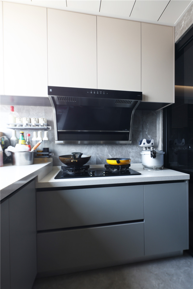 无拉手设计、高低台面、挡水条等,该厨房设计遵从着实用、简洁理念,打造幸福美好生活。
