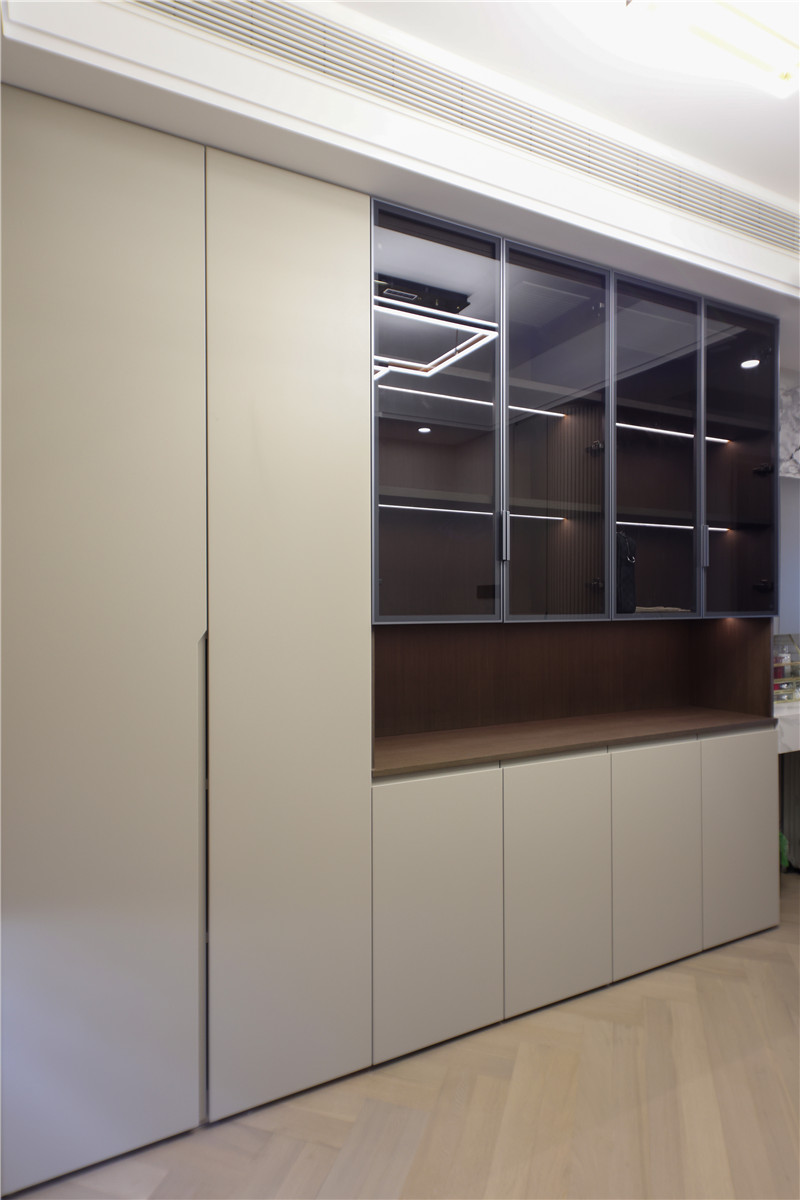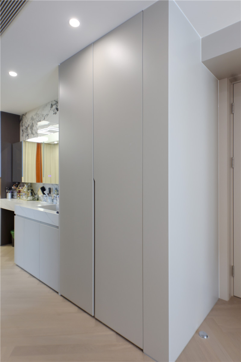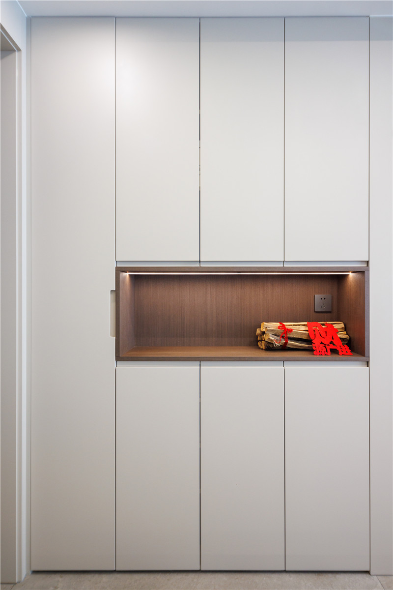 简约风格的家更注重功能,两侧阳台柜一个做家政柜使用,一个做洗衣区,分区明晰,在无序的生活中以整洁有序带给家更多美好。