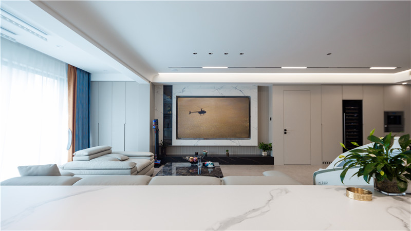 白色大理石悬挑电视背景墙,以格栅造型打底,留有黑玻展示柜,增加客厅的纵深感与层次感。