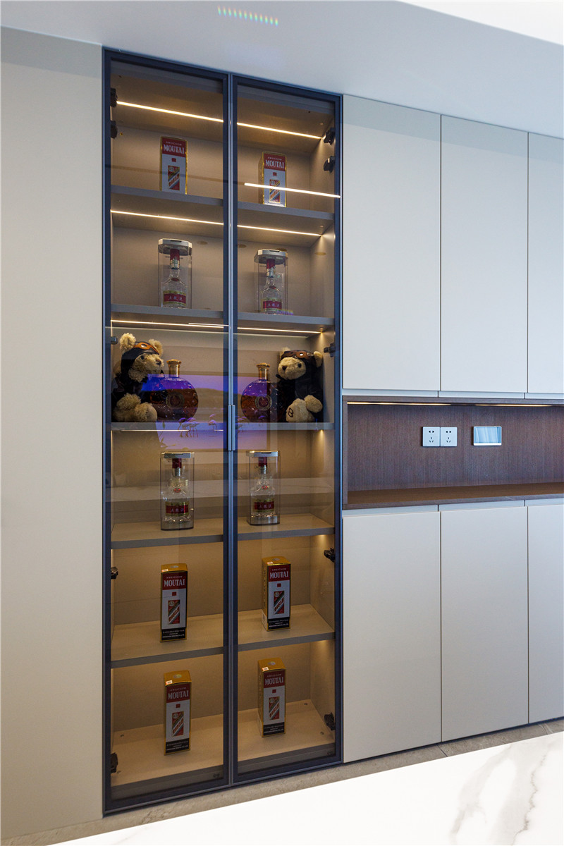 在沙发背景一侧,星空(中国)xingkong用一组岛台与餐桌的设计形成空间上的划分,沿着墙壁走势设计的酒柜与次卧门齐平,这样整体做嵌入式的柜体收纳会让空间显得更轻盈。半透茶色玻璃柜门也很好地展示了藏酒与工艺品,彰显屋主的生活格调。