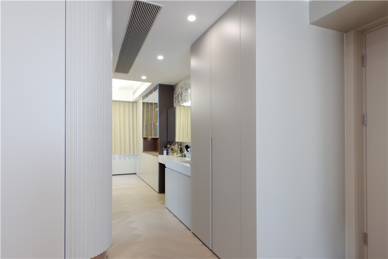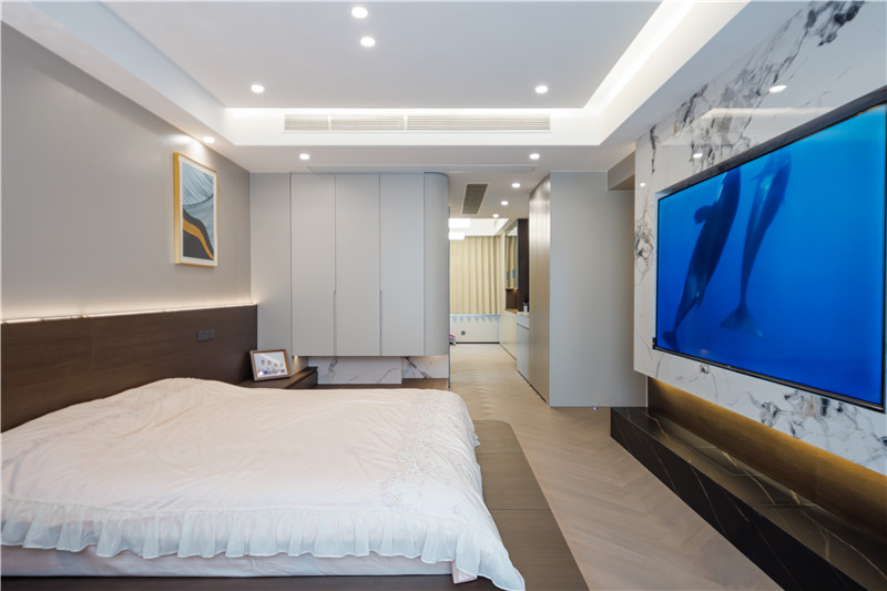 推开与餐边柜相连的门即进入主卧空间,打通了卫生间和衣帽间的设计让主卧变身功能性十足的高品质卧房。