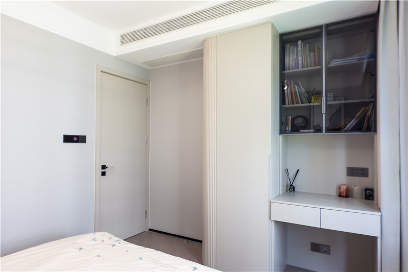 男孩房的设计上除了基础的睡眠区和收纳区还增设了一个学习区,穿插的设计手法减少了小空间内高柜的压抑感,在满足实用性的同时提升居住的舒适度。