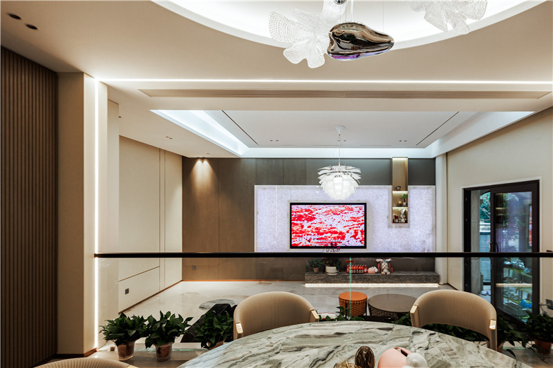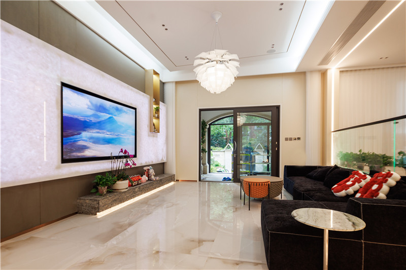 仿石材电视背景墙暗藏的灯光渐亮,整个屋子的氛围便围绕华贵与精致展开,不规则的开放格设计颇有现代感意味。