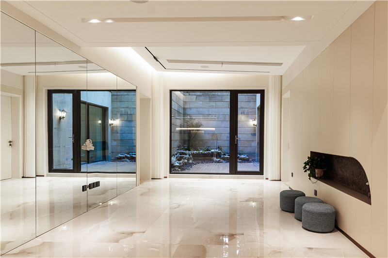 负一层的空间被划分为多个功能性房间,客厅区域作为舞蹈教室或是瑜伽教室来使用,用整面到顶的柜体做背景墙,中部不规则掏空让空间更有呼吸感。