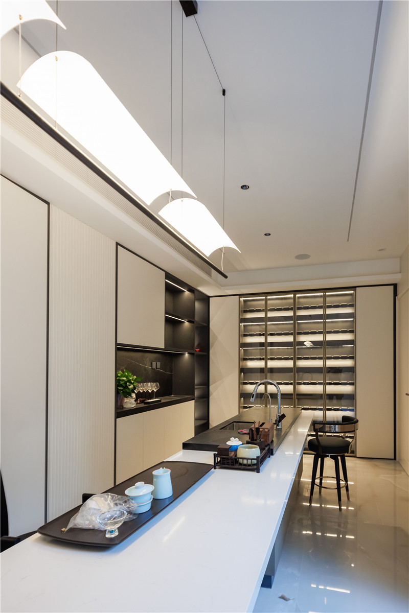 靠近庭院的里间做成了茶室和酒柜的结合区域,似船帆般的吊灯颇有雅奢气质,酒柜在各种灯光的照射下颇显不凡质感。推杯换盏,觥筹交错,在这空间里,品的是茶或是酒,赏的是树或是叶,感悟的是人生。