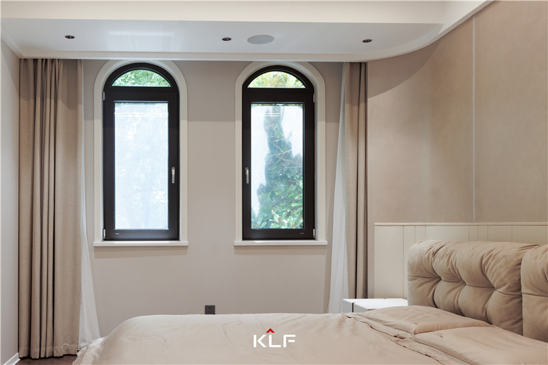 进入次卧空间内便是次卧的衣帽间,到顶的柜门采用一体化的铣型拉手,更显简洁干净。次卧空间的自然光线来源于两扇拱形窗户,让整个房间通透的同时增添了一份奶油风的温馨治愈。