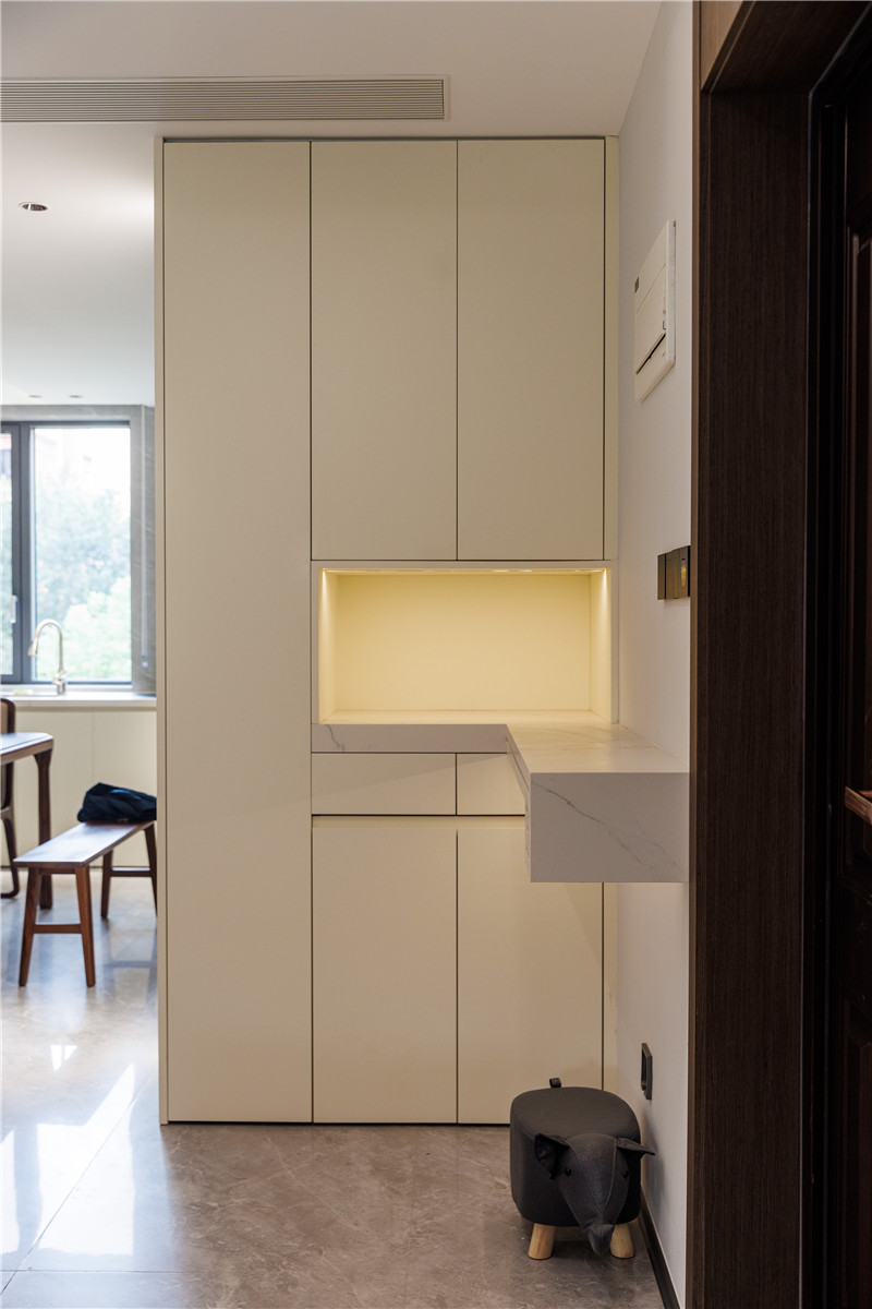 在玄关为了提升空间利用率,星空(中国)xingkong采用了嵌入式的柜体进行上下分区收纳。中部掏空后延伸大理石台面作为置物台,放置一些小物品都很实用。
