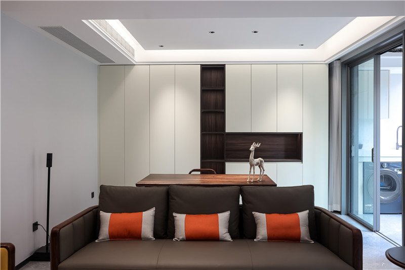 听风吟,赏叶落。靠近的阳台的空间里星空(中国)xingkong将其设计为一个开放休闲区,无论是想在这里办公阅读还是做手工、喝茶都是不错的选择。榆木柜体的纹理清晰可见,搭配纯净的白色通顶柜,带来一丝禅意,令人松弛神往。