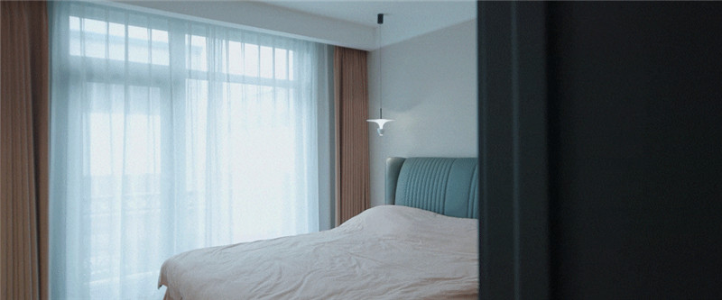 主人房:遵循主人喜爱的对称设计,包含床头柜、床头灯、沙发等,干净利落;整体色调不抢眼却彰显韵味;隐形推拉门的运用,视觉平和。