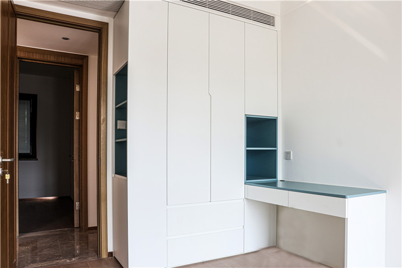次卧:依旧采用整面到顶衣柜,一侧薄侧柜隔层放装饰物,一侧柜体延伸做床头柜,以雾霾蓝作为跳色,更显活泼灵动。