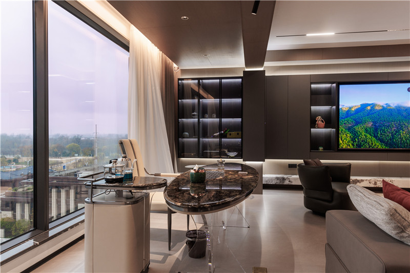 餐桌双圆弧造型,配合以整面餐边柜(中部掏空且预留轨道插座),木与玻璃的组合将收纳力有效保障。