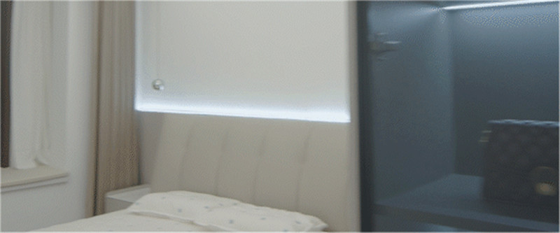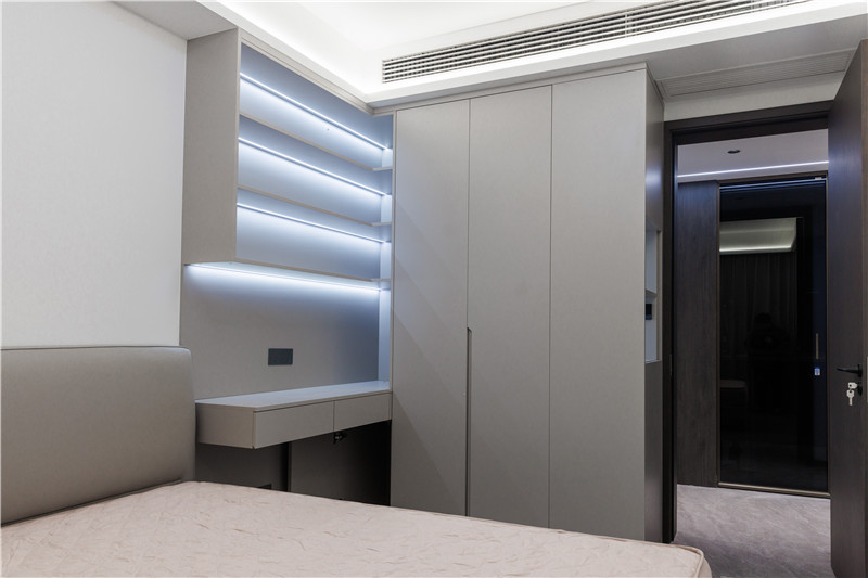 梳妆台与床头柜结合,上方做开放区并嵌入条带灯,有效解决视觉死角问题;抽屉做无拉手,避免梳妆时的遮挡;侧边衣柜到顶设计,边角做薄侧柜,存储在线。