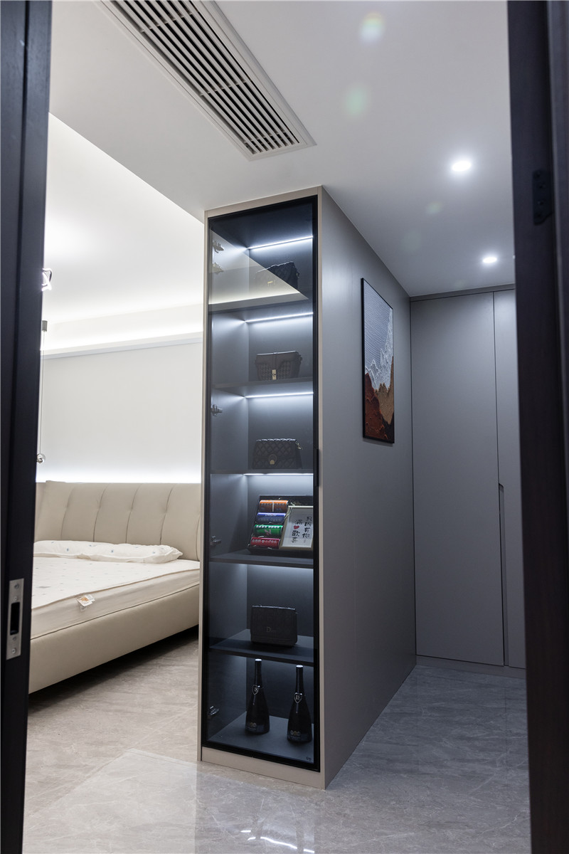 一组衣柜作为隔断分离出小型衣帽间,一柜双用突显设计智慧;隔断柜窄侧玻璃柜展示,与众不用;内侧立柜双开,可根据屋主需求进行合理分区,为便捷高效的找寻助力。