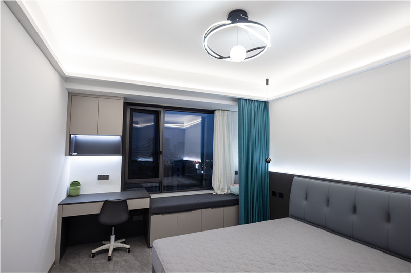 进门靠墙立柜延伸床头柜,内侧色彩协调以床头背景墙,干脆利落;靠窗收纳柜与书桌错位结合,便捷实用;整屋主灯与辅灯结合设计,氛围感在线。