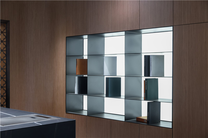 进门整面茶白立柜做铣槽拉手,中部雾霾蓝做点缀并加入三角造型,增强空间活泼性;侧边展示柜以圆弧收边,安全系数高。