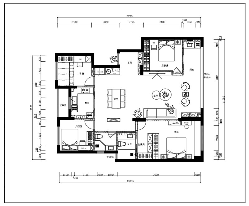 女孩房整体无主灯设计,打造出温馨柔和的氛围感;衣柜呼应于男孩房设计,兰迪米灰色低调且不失质感,床头柜上下方预留插座,方便实用。