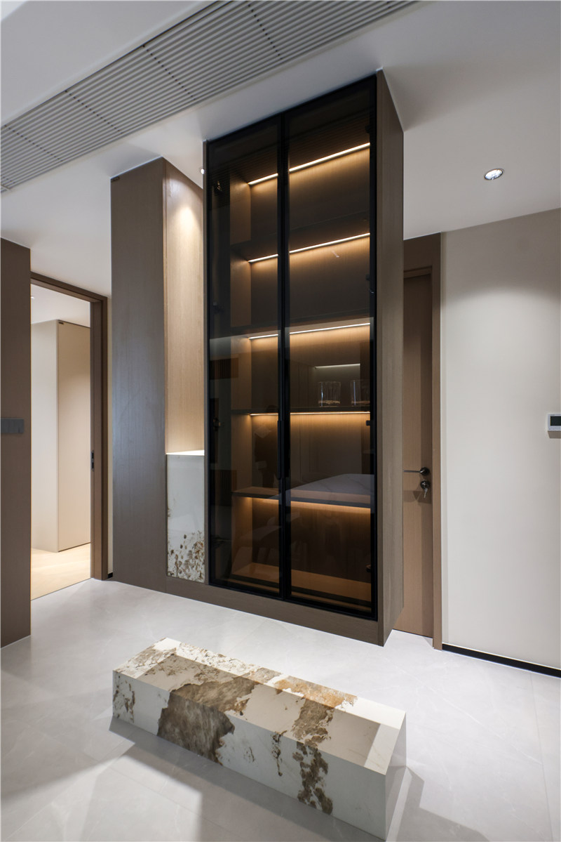 进门玄关柜与电视柜组合,连接处以圆弧收边,杏仁黄色调通铺展现高级柔和气质。玄关侧边高柜便捷挂衣,中侧穿插抽屉、背板跳色配合以栅格造型,彰显个性化美感。