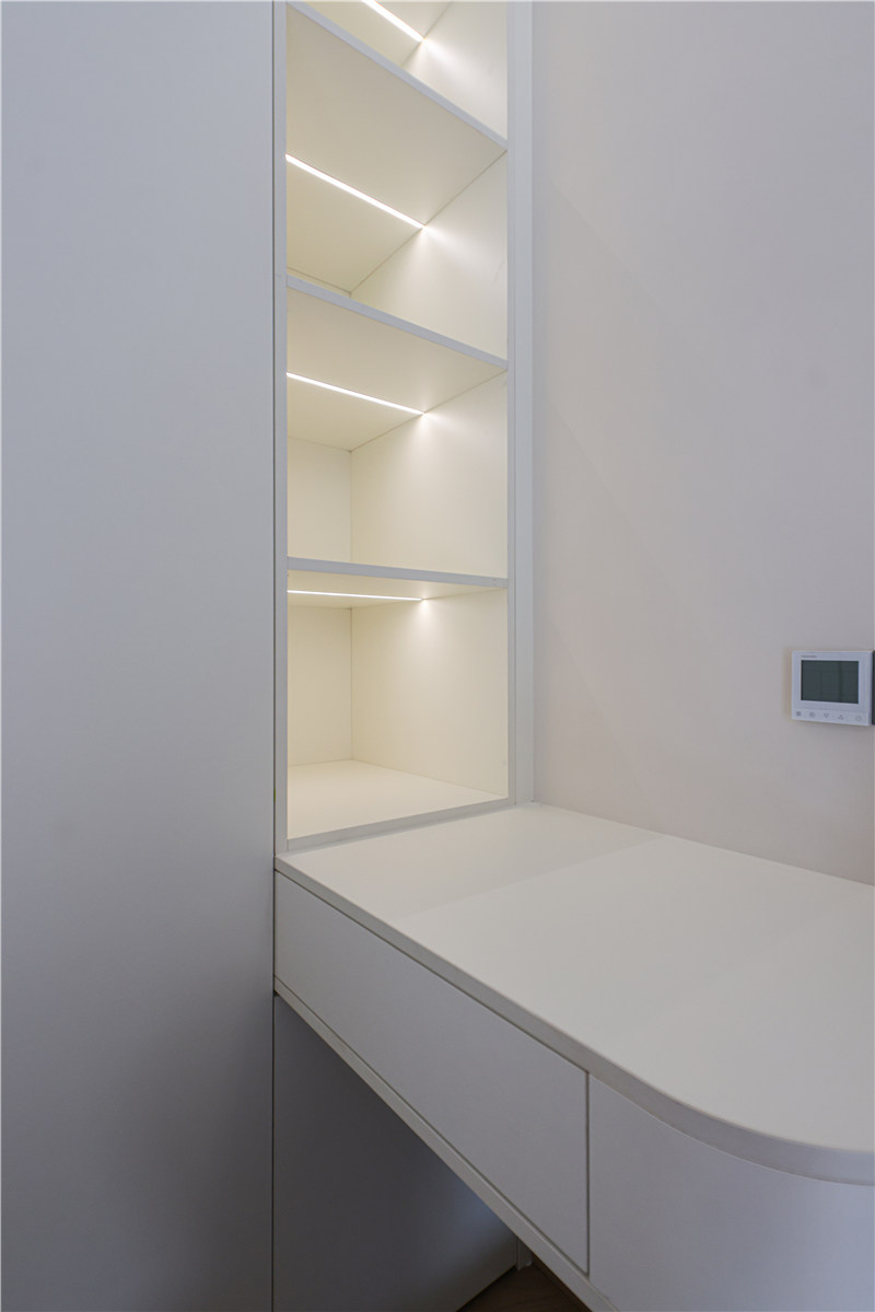 一侧阳台柜藏露结合,收纳物件的同时可进行DIY装饰;一侧做洗烘一体式洗漱台,可与男孩房共用,满满设计感。