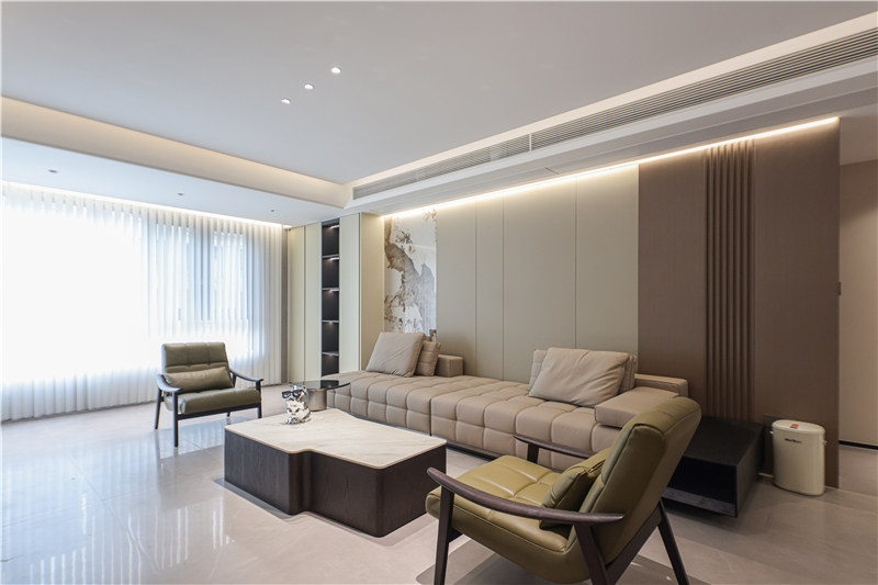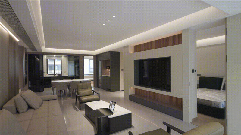 电视柜以木色格栅及辅助灯光建立层次感,电视机内嵌、灰调一字型底柜视觉加深,主次分明;沙发背景墙为拼接式设计,大理石花纹、水漆背景墙、纵向格栅衔接,好看雅致。