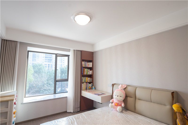 靠窗做小区域书柜,柜体延伸为床头柜,可做书桌、梳妆台使用;室内柜体合理分区、飘窗区作为闲适区,整体温柔好看。