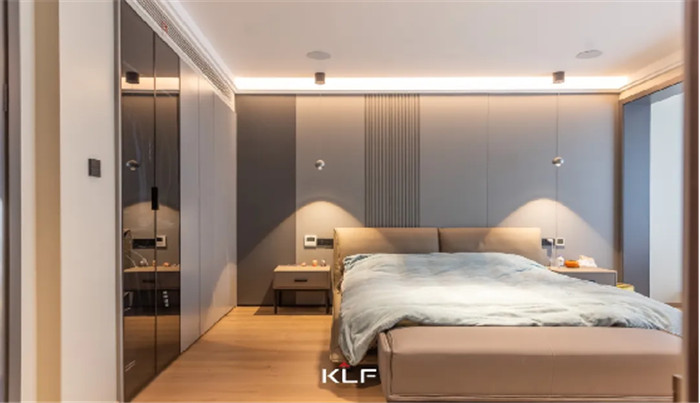 衣柜采用一柜到顶式设计,免去顶部打扫并增强收纳能力。衣柜设计黑玻柜门增加轻奢感,并减缓大面积柜体带来的沉闷。