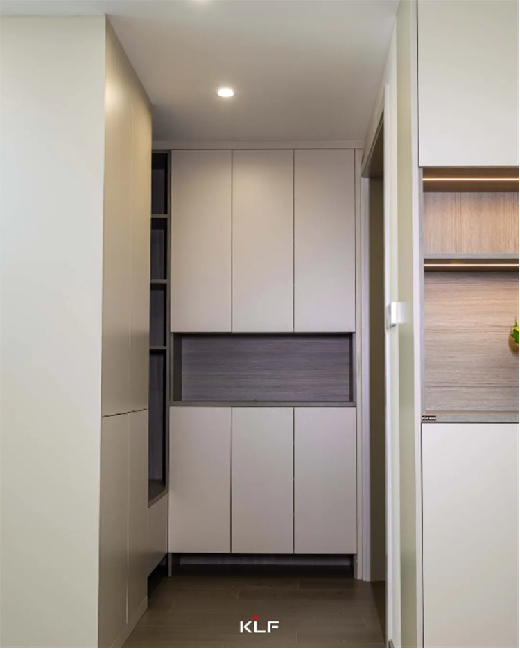 入户的玄关走廊处做上了到顶的鞋柜,鞋柜的底部留空加上藏光,在鞋柜当中还留了开放储物区域,平时使用非常方便。