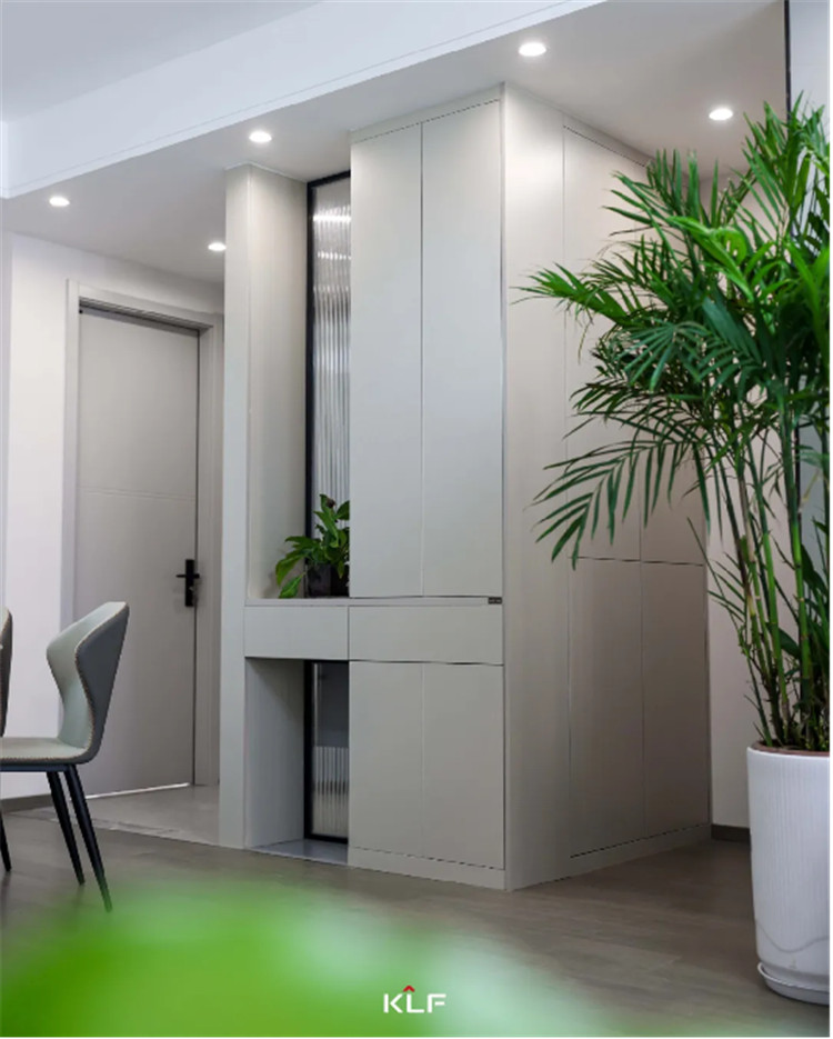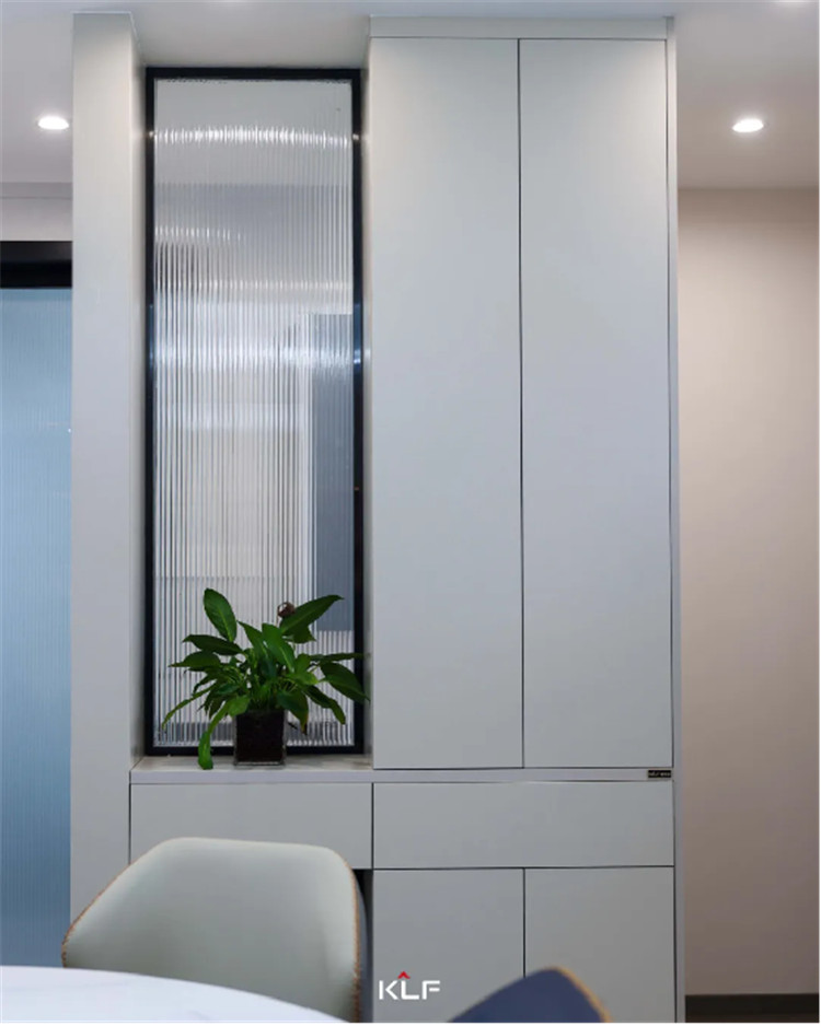 在餐厅与卫生间的区域间以一组隔断柜去进行空间美化,穿插的设计手法以抽屉分隔整个高柜,整体尺寸更加协调,中部加入长虹玻璃的设计可以搭配绿植或是手办摆件,整体会更精致。