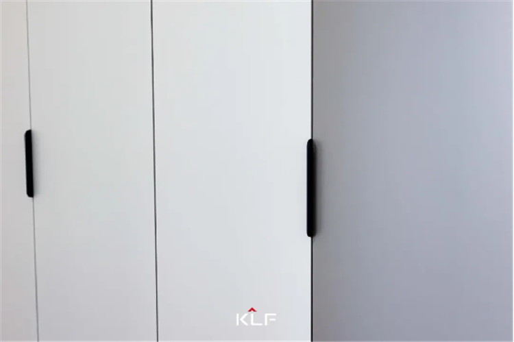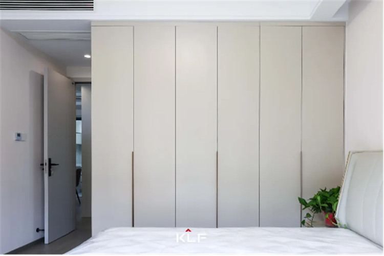 主卧室作为屋主的休息区,整体更强调收纳性和舒适度,采用茶白的色彩与全屋白色系更适配,一门到顶的整排衣柜采用的是一字型通体拉手,方便使用。