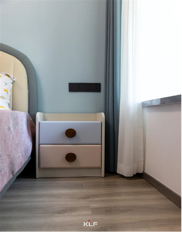 在色彩上,兰迪粉柔和可爱,芬蓝色清新淡雅,搭配布鲁灰门板十分协调美观。