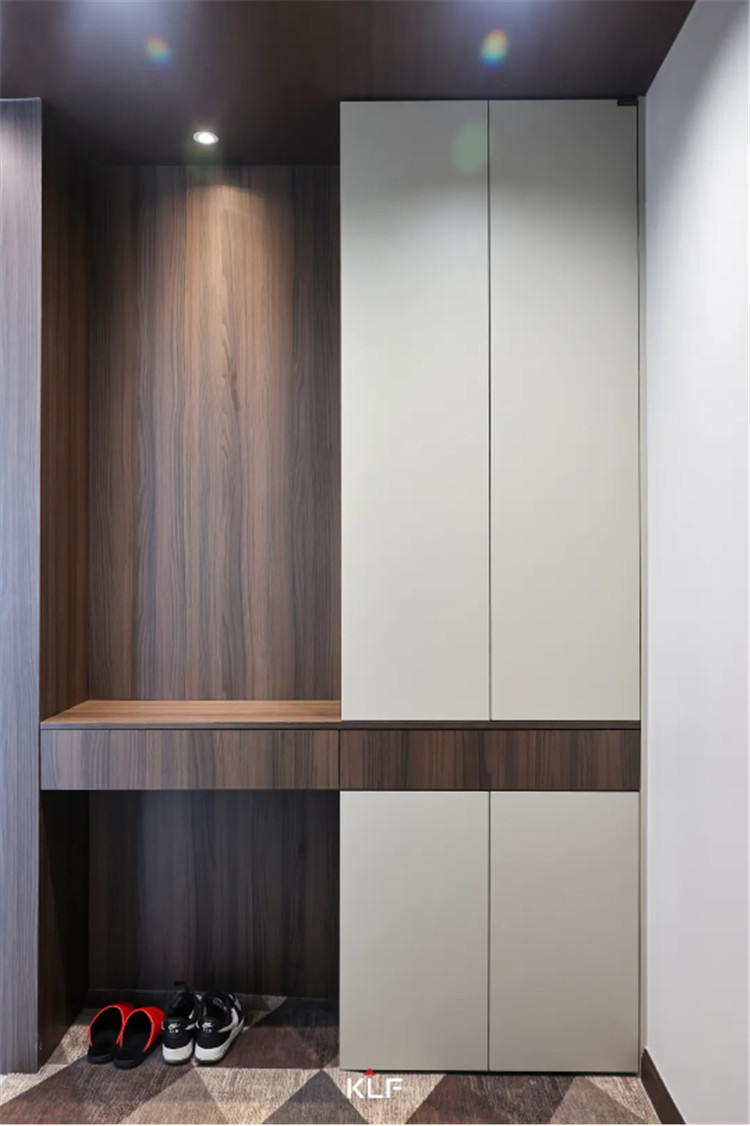 玄关造型充满归家的仪式感,靠墙进门一侧做穿插式设计,木色与白色融合,柔和色调营造舒适自由的居心之所。