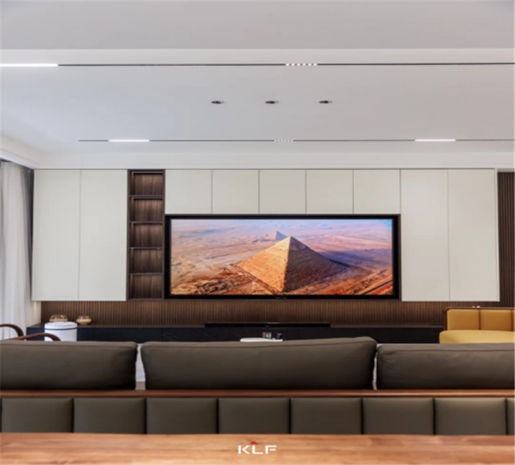 细格栅的造型墙板为墙面增加了立体感,一字型深灰色地柜直接落地,内嵌3D雾化暖炉,带给家更多温馨。